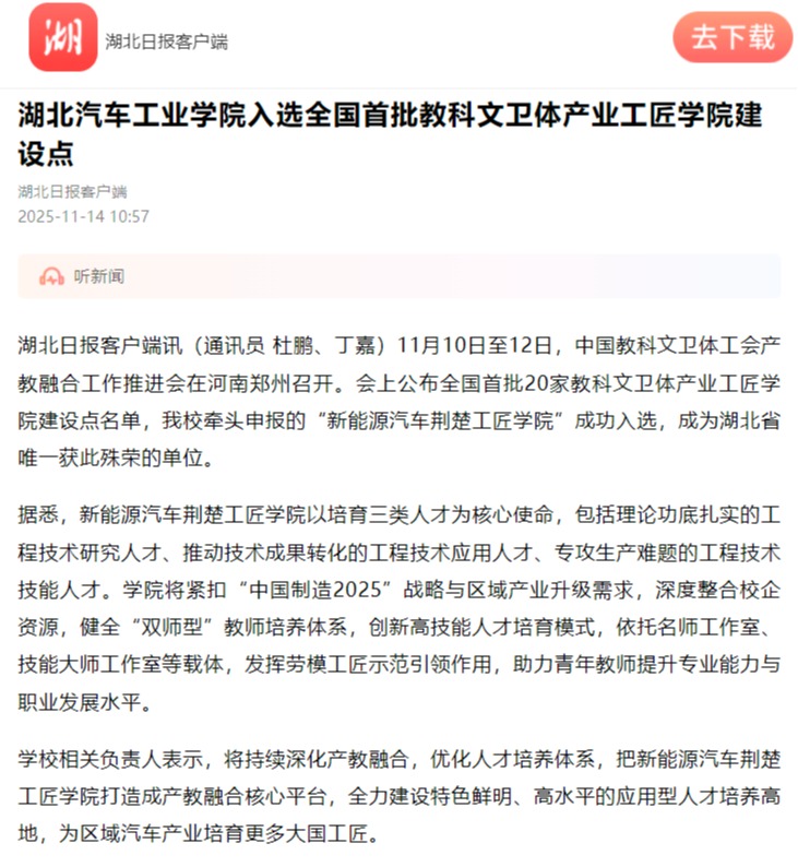 【湖北日报】beat365在线唯一官网入选全国首批教科文卫体产业工匠学院建设点