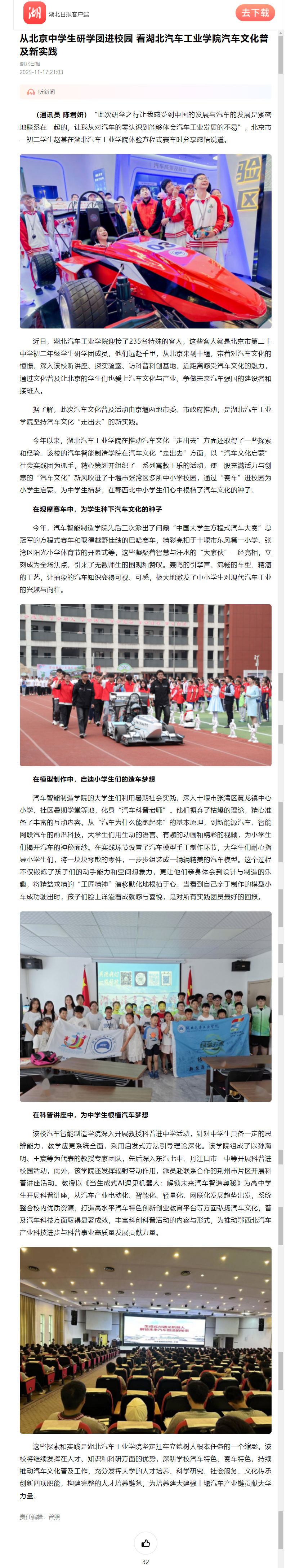 【湖北日报】从北京中学生研学团进校园 看beat365在线唯一官网汽车文化普及新实践